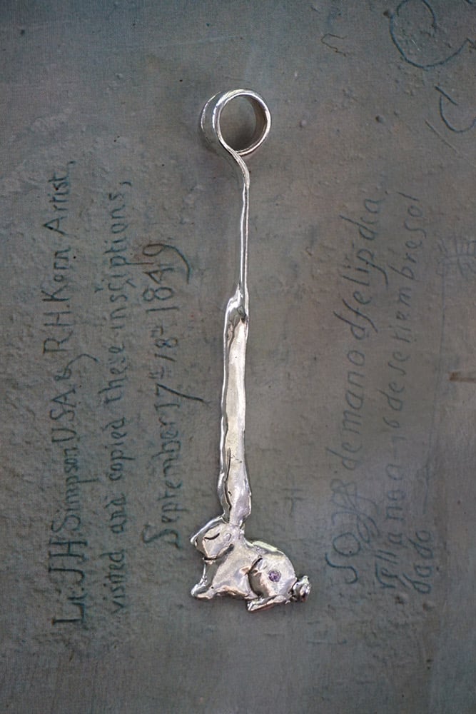 Hand-sculpted and cast .925 silver rabbit toke pin with lavender spinel faceted stone.