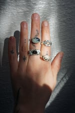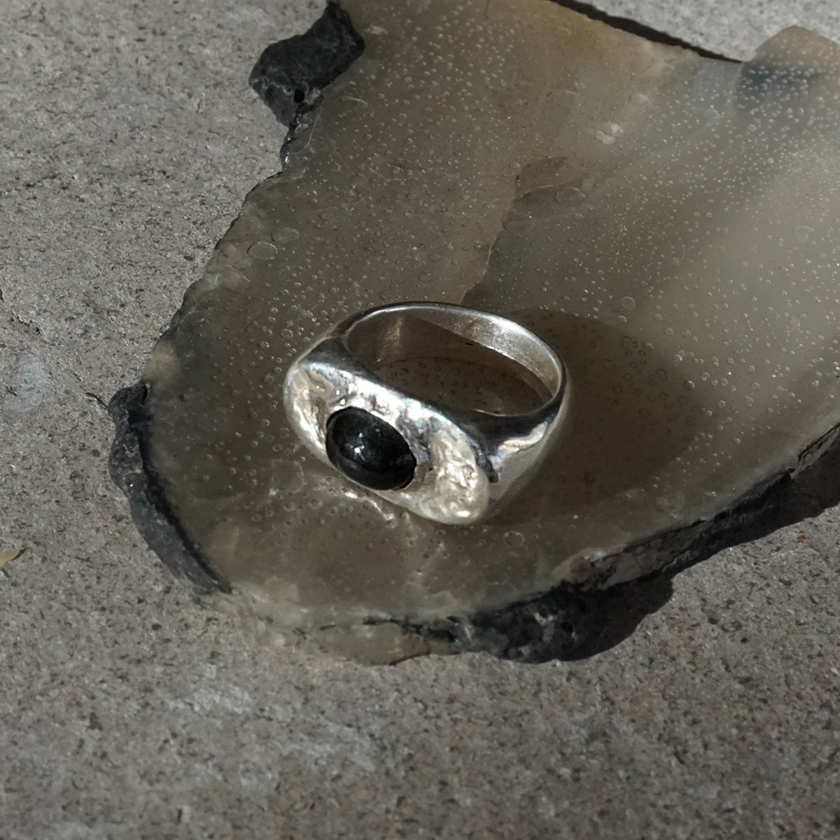 Hand-sculpted silver signet ring with textured face, set with a light-refracting black diopside cabochon.